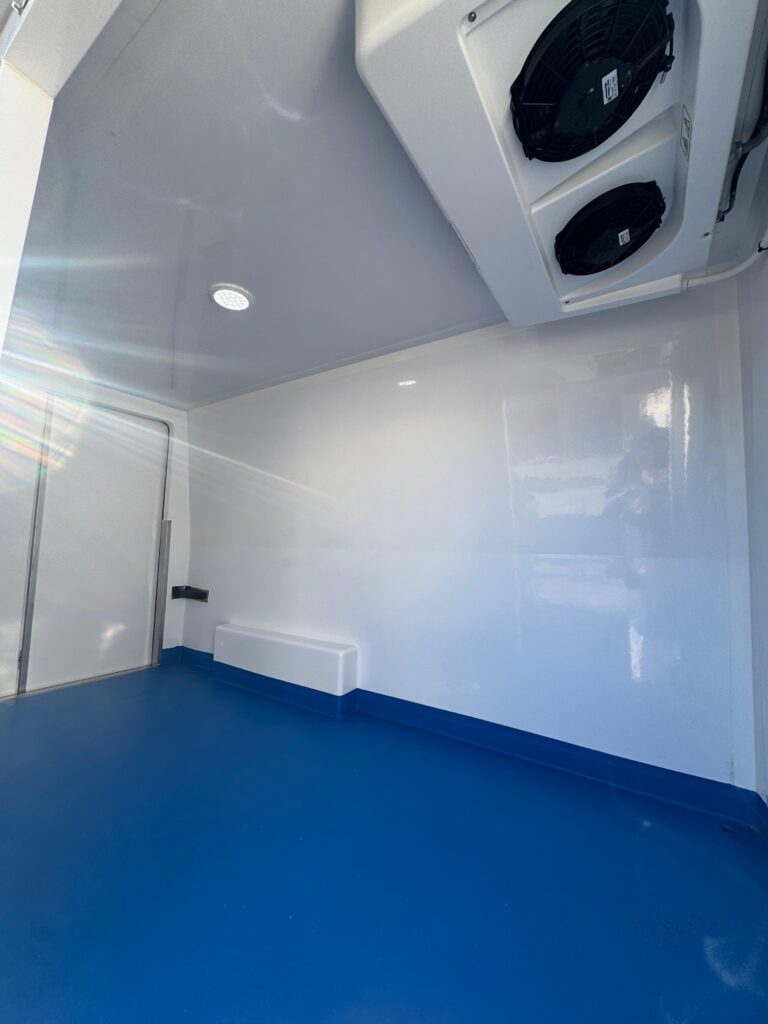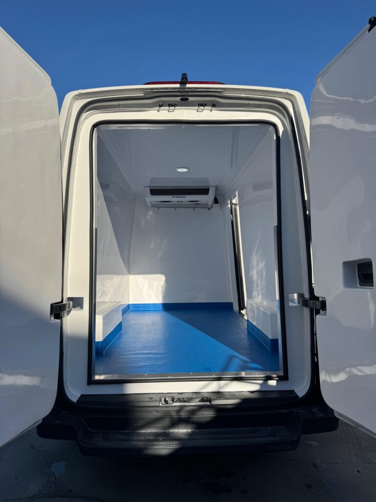La nueva furgoneta, ha sido revestida con un isotermo reforzado que incluye puerta lateral independiente dado que el cliente, al que le hemos instalado un equipo de frío marca Thermo King modelo C-350 MAX 10, trabajará a temperaturas bajo cero dentro de este vehículo ya apto para el reparto de sus productos.