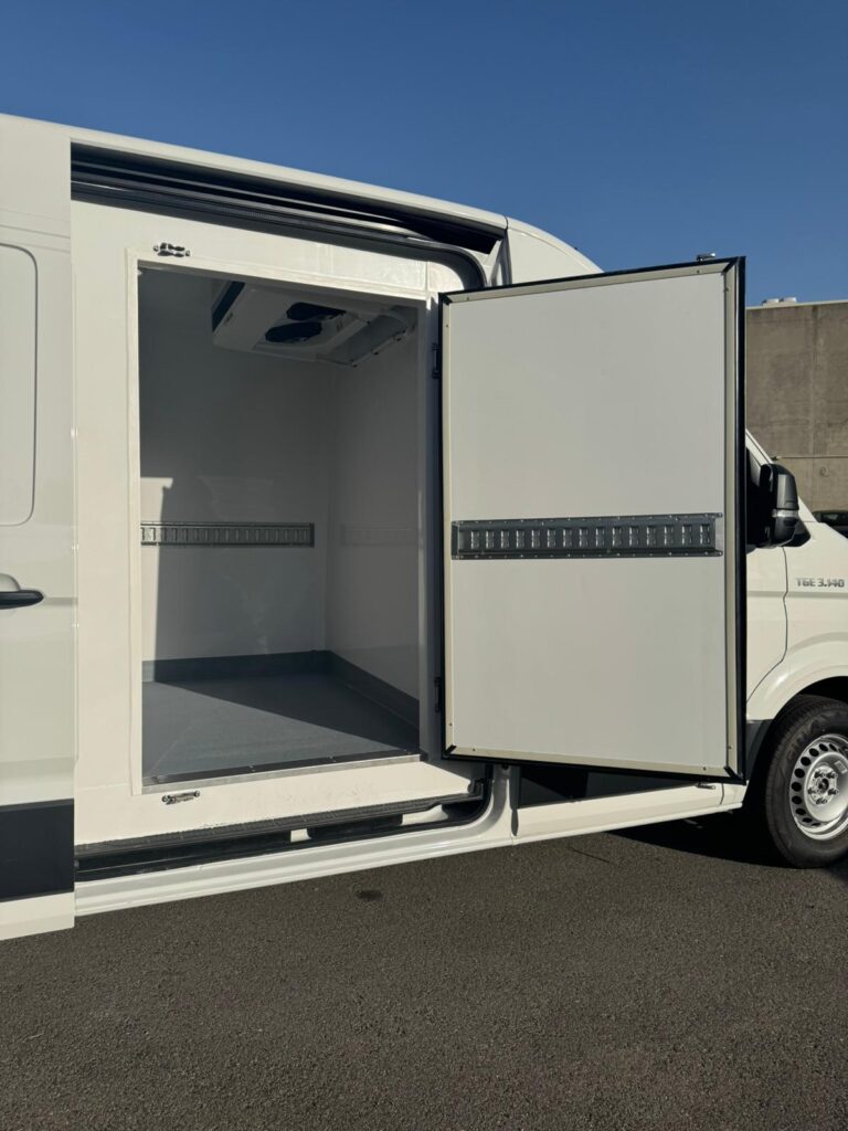 En cuanto al isotermo reforzado, este cuenta con una banda de amarre a cada lado y una puerta lateral independiente, así como dos plafones LED con sensor, debido a la amplitud de la nueva furgoneta MAN con isotermo reforzado y equipo de frío.